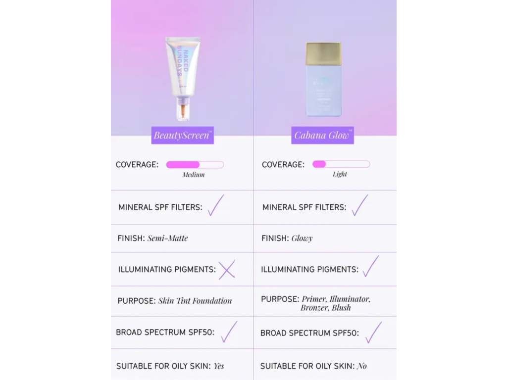 Predstavujeme vám BeautyScreen™ SPF50 Skin Tint, tónovaný makeup od Naked Sundays, vaše nové tajomstvo žiarivej a chránenej pleti. Tento ultraľahký make-up s efektom druhej kože poskytuje prirodzené, vrstviteľné krytie od ľahkého po stredné a je dostupný v 5 flexibilných odtieňoch, ktoré sa prispôsobia každému tónu pleti. Zároveň chráni pleť s minerálnym SPF50 bez nanočastíc pred UVA, UVB, modrým svetlom aj infračerveným žiarením.